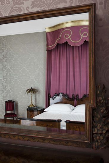 The renovated rooms are divided into five categories according to their chromatic tone: black cherry red, mustard, aubergine, sugar paper and cocoa. Each one preserves the period furniture and details, as well as the parquet floors and the Italian marble bathrooms.