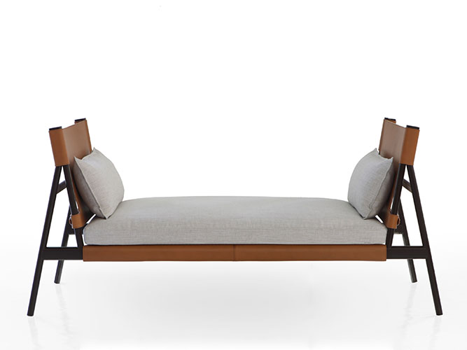 Some projects highlight the attention to detail and the search for interesting shapes, such as Traveller by GamFratesi. Traveller is a dormeuse with a trestle structure and lateral backrests in “saddle-effect” leather with two matching fabric-upholstered cushions.‎ Traveller has a metal structure, as does Gap, the vertical wall-hung bookcase designed by Carlo Tamborini in his first collaboration with Porro.