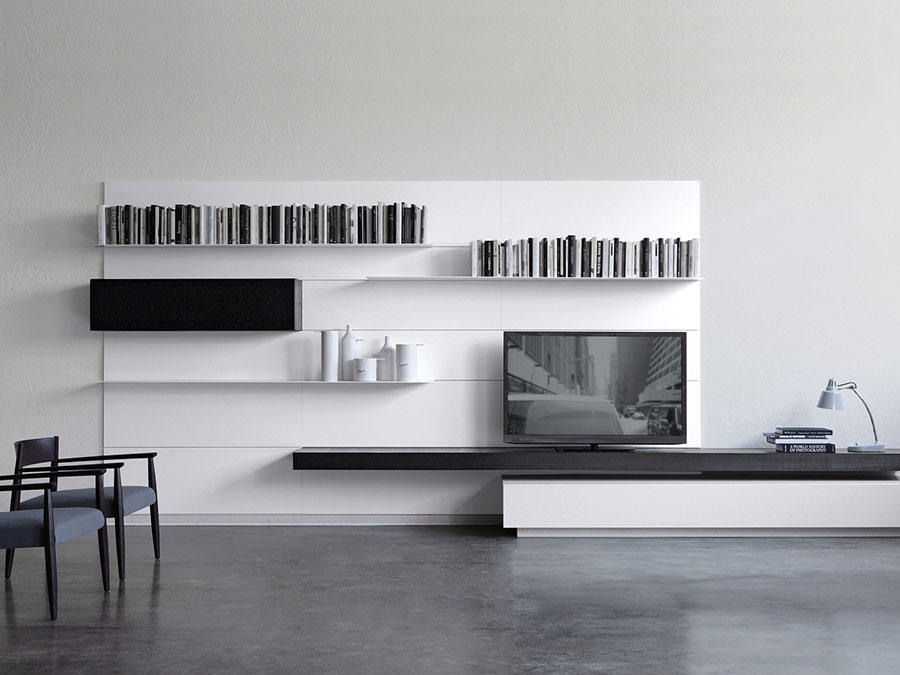 The versatility of Porro Italian furniture also allows you to furnish the living area and the office. With System, wall units and partitions can be custom-designed. Among the latest products is Hanging, a system that allows you to create a configurable suspension wall system.