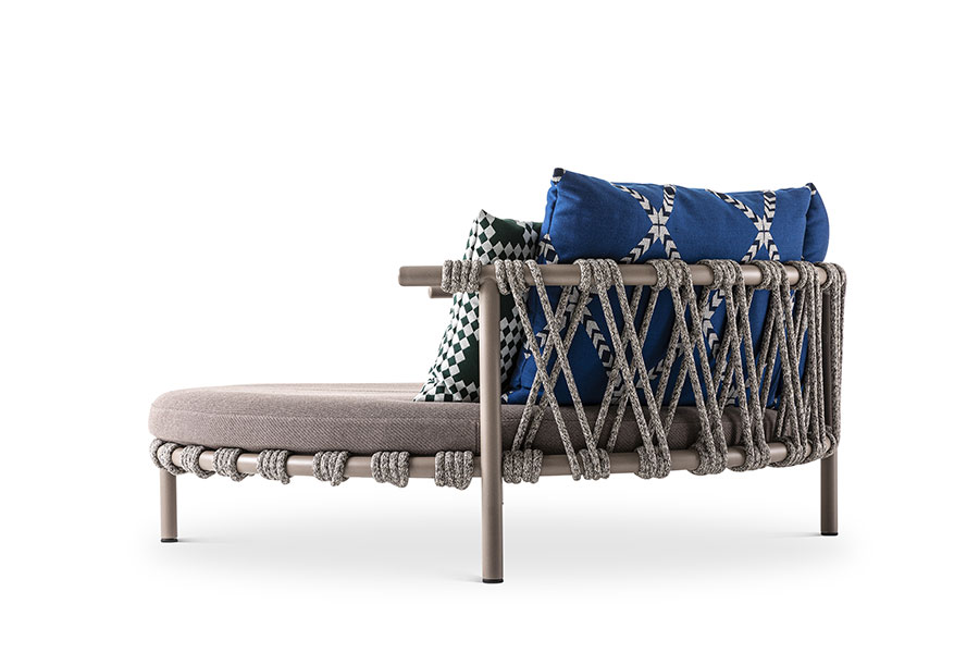 Proposals for outdoor relaxation, designed to create luxurious islands of comfort. As with Brixx by Lorenza Bozzoli, a flexible system composed of rectangular modules and the brand’s first upholstered collection, or Rily by GamFratesi, a collection that ranges from chairs to deckchairs, from the cocoon armchair to the large double sofa bed with canopy.