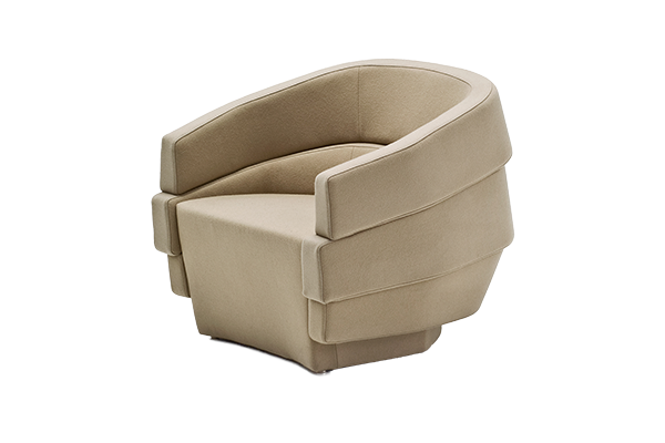 Gogan Armchair, a soft, sculptural form in perfect balance. Patricia Urquiola is inspired by the culture of distant lands, creating a harmonious composition of smooth, irregular shapes that resemble stones.